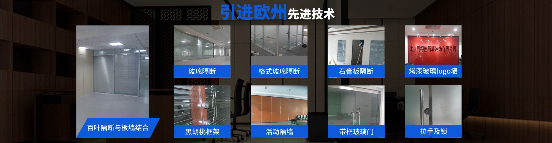 北京隔得佳隔墻裝飾有限公司主要制作與銷售:辦公隔斷,玻璃隔斷,不銹鋼隔斷,辦公玻璃隔斷,雙玻百葉隔斷,活動隔斷,単玻隔斷,辦公玻璃屏風,背漆玻璃隔斷,遙控電動百葉隔斷,酒店屏風,宴會廳隔斷,酒店隔斷,固定隔斷,移動玻璃隔斷,活動玻璃隔斷,多功能廳隔間等等,活動隔斷系列廣泛用于會議室,酒店,酒樓,賓館,多功能廳,展廳等場所;玻璃隔斷系列多用于寫字樓,金融機構,政府辦公,醫院,工廠等場所。